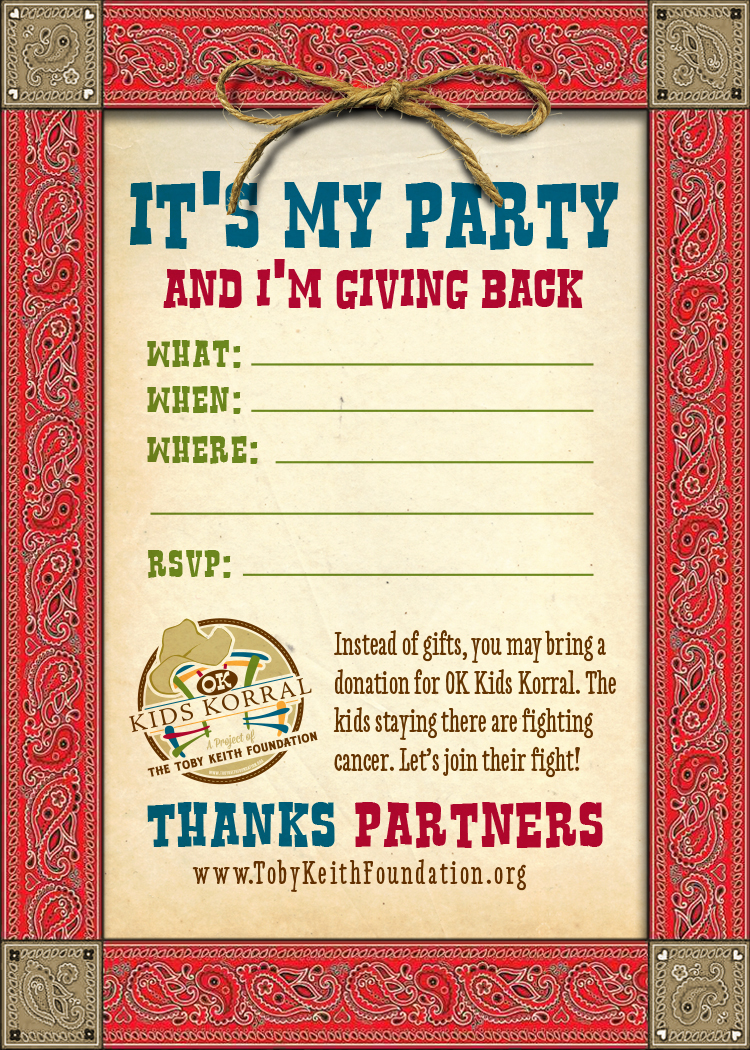 Donating a birthday, anniversary or special celebration is the gift that keeps on giving love and hope to the families who call OK Kids Korral home during their cancer treatment. Your friends and family get to celebrate YOU by giving a monetary gift or donation item in YOUR honor. You can download our invitation template or create your own to fit your party theme. Just let us know the details and we will arrange a date for you to drop off your donations.